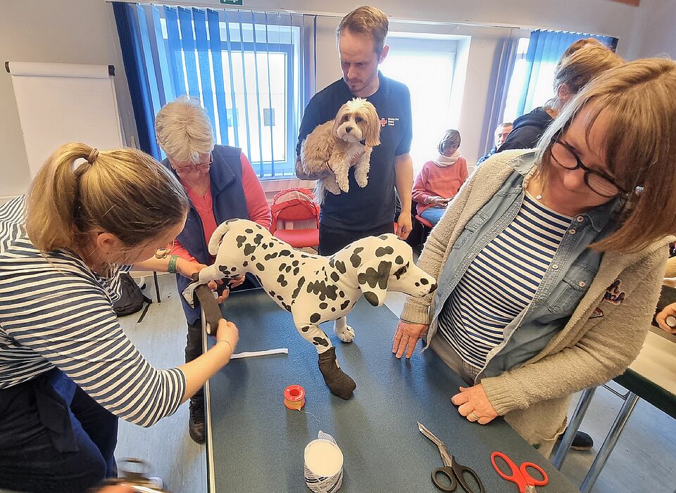 „Genau wie beim Menschen gilt auch für die Erstversorgung beim Tier: Wer sich vorbereitet, ist im Ernstfall schneller handlungsfähig“, erklärt Kursleiter Patrick Rüß. Der Erste Hilfe-Ausbilder beim DRK Lübeck ist selbst Hundebesitzer und für das kürzlich gestartete Angebot des Kreisverbandes speziell geschult worden. „Beim Gassi gehen besteht häufig die Gefahr, dass sich die Vierbeiner zum Beispiel an einer Glasscherbe schneiden, in Konflikten mit anderen Hunden gebissen werden oder etwas Giftiges fressen. Auch der Straßenverkehr ist eine Gefahrenquelle.“