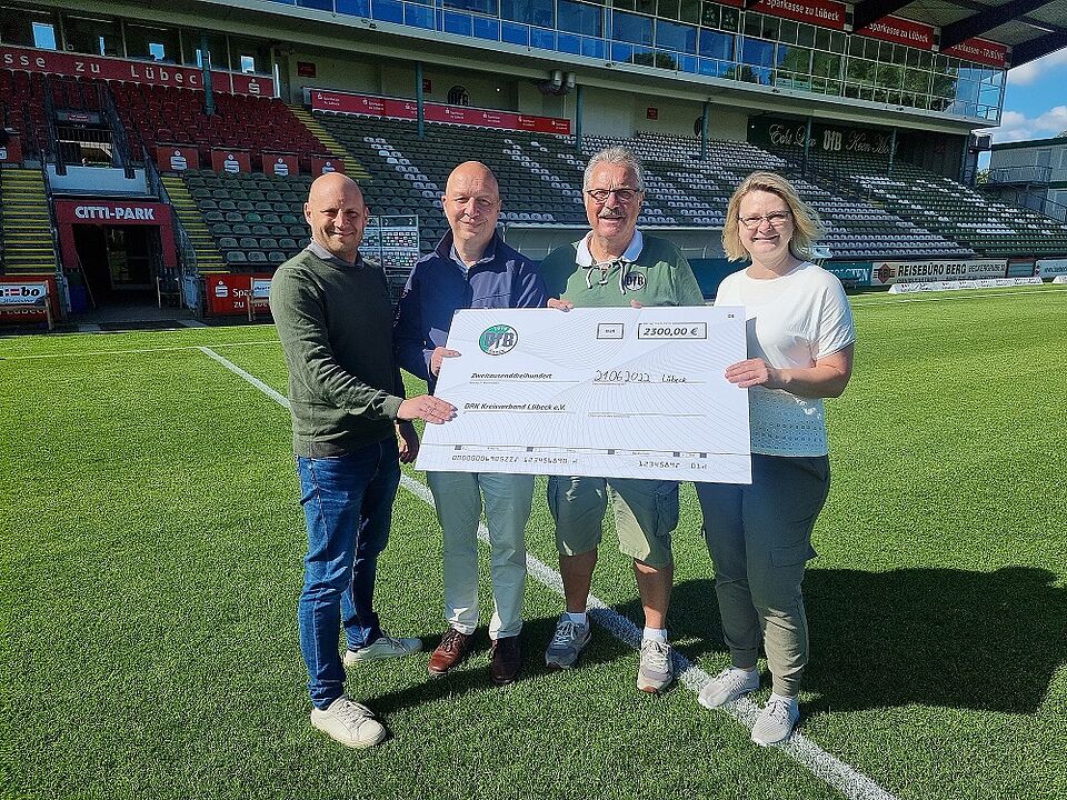 Zugunsten der Ukraine-Hilfe des Deutschen Roten Kreuzes (DRK) hat der VfB Lübeck in der vergangenen Saison bei zwei Heimspielen in der Meisterrunde gesammelt. Mit den Spendendosen und Pfandbecherspenden kamen insgesamt 2.300 Euro zusammen. Ein symbolischer Scheck in dieser Höhe wurde jetzt von den VfB-Vorstandsmitgliedern Christian Schlichting und Daniela Wedemeyer an den Lübecker DRK-Vorstand Stefan Krause übergeben. Mit dabei war zudem Bau-Ingenieur Peter Behncke, beim VfB rund um alle baulichen Fragen im Stadion verantwortlich. Behncke hatte sich im Verein besonders für die Hilfsaktion eingesetzt und auch eine große Einzelspende beigetragen.